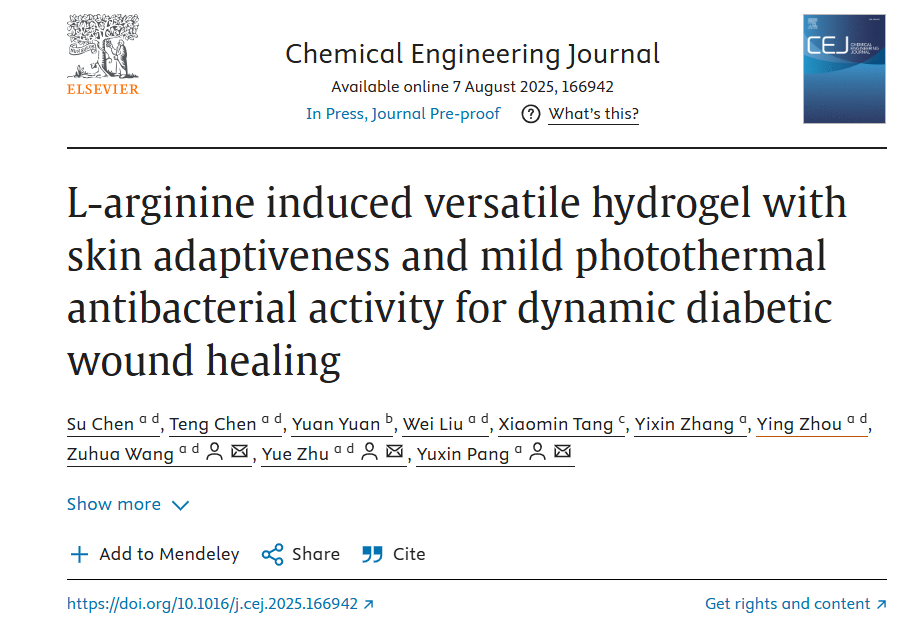日前,我校药学院研究生在《Chemical Engineering Journal》期刊(中科院双一区,TOP期刊,IF:13.2)发表题为《L-arginine induced versatile hydrogel with skin adaptiveness and mild photothermal antibacterial activity for dynamic diabetic wound healing》的学术论文。该研究是学校艾纳香研究团队在艾纳香研究领域的最新创新成果,2023级硕士研究生陈素为论文第一作者,庞玉新教授、汪祖华教授和朱月副教授为共同通讯作者。
